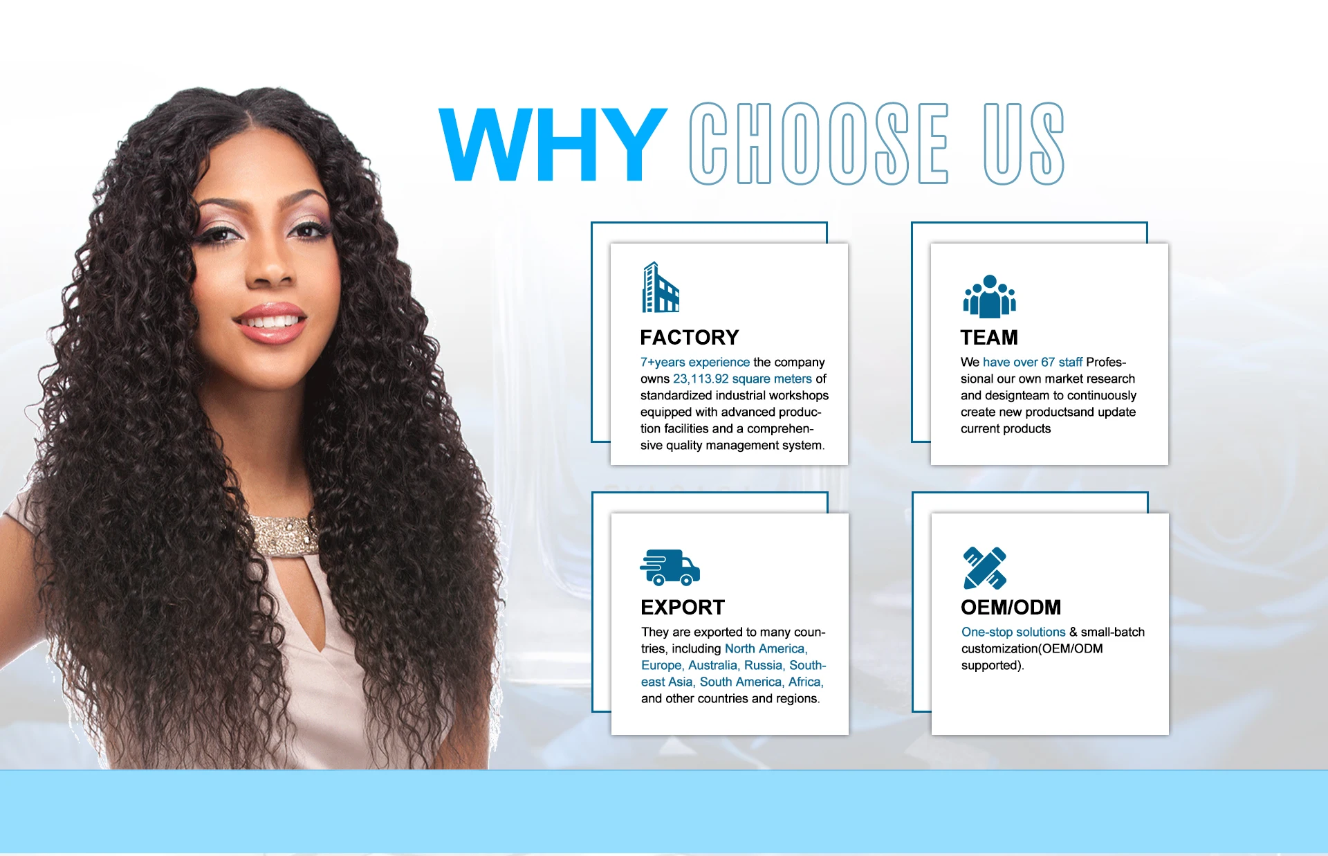 Prodotti principali: Parrucche, capelli ricci, capelli lunghi lisci, shorthair, taglio di capelli Bob